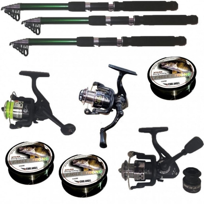 Set de pescuit cu trei lansete, trei mulinete si montura