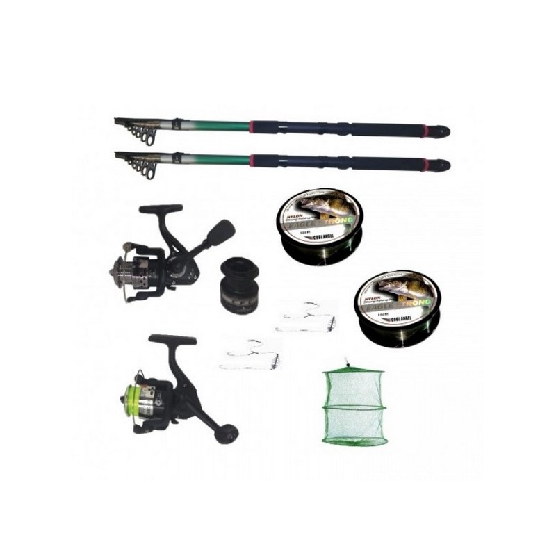 Setul de pescuit cuprinde două lansete, două mulinete și accesorii esențiale pentru o experiență reușită în domeniul pescuitului.