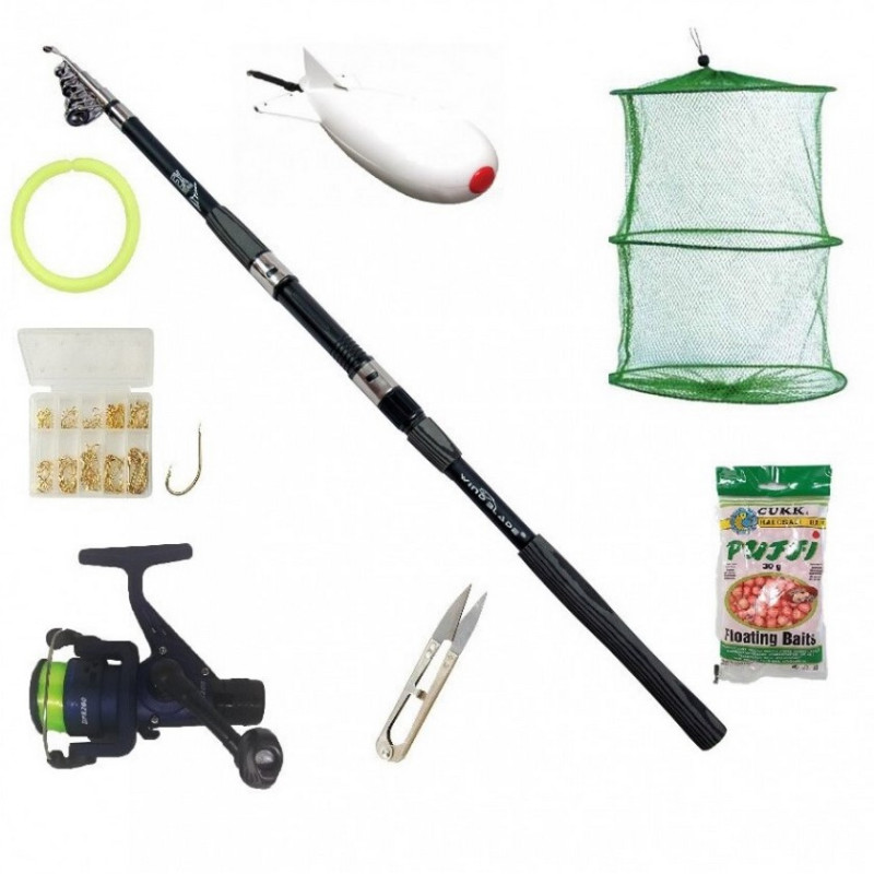 Kit pescuit sportiv cu lanseta windblade 2,1m, mulineta dpr200, spomb, juvelnic, cutie ace, bambina si accesorii.